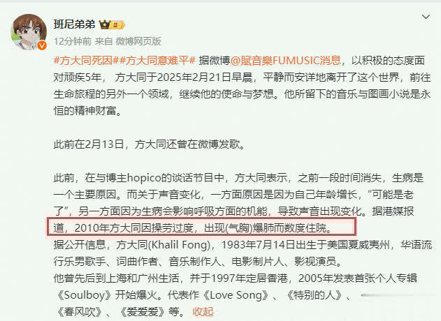 大约在10年左右,港媒曾透露方大同因多度劳累导致气胸,也就是所谓的爆肺,数度住进了医院。早前,方大同在与博主hopico的谈话节目中也曾表示:生病会影响呼吸方面的机能,导致声音出现变化。